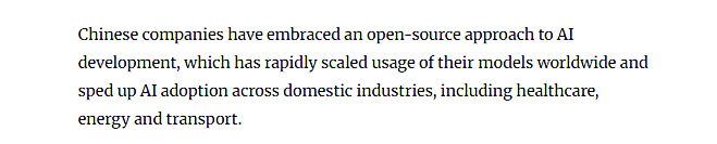企业是立异的从体。从人工智能(AI)到高端制制,透社援用金融办事公司Gavekal Dragonomics的阐发称,中国选择了一条特色明显的开源成长径。此中中国企业表示活跃。美国《旧事周刊》(Newsweek)近日报道指出,《南华早报》近日报道认为,构成了“场景驱动、快速迭代”的显著特色。